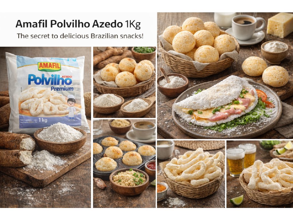 Amafil Polvilho Azedo je fermentovaný tapiokový škrob z manioku, typický pro brazilskou kuchyni. Dodává pečivu lehkou strukturu, pružnost a charakteristickou chuť.