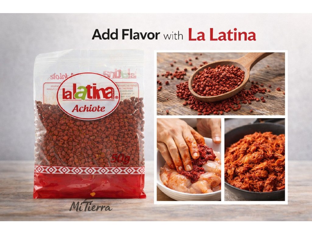La Latina Achiote contains whole annatto seeds traditionally used in Latin American cuisine. They provide a natural red-orange color and a mild, earthy flavor to dishes. Commonly used to prepare achiote oil or to season rice, meats, and stews, the seeds are typically infused in oil or ground before use.