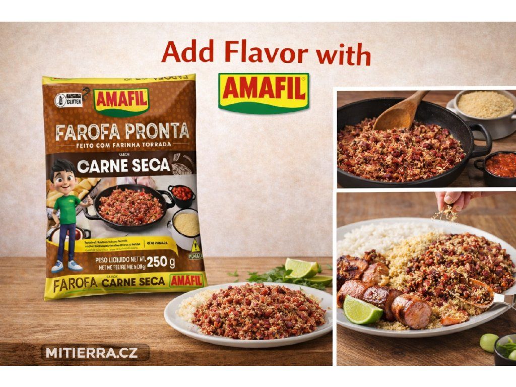Amafil Farofa Carne Seca is a toasted cassava flour mixture flavored with dried beef seasoning. It has a crumbly texture and savory profile typical of Brazilian cuisine. Ready to use, it is commonly served as a side dish with grilled meats, rice, and beans, adding both flavor and texture to everyday meals.
