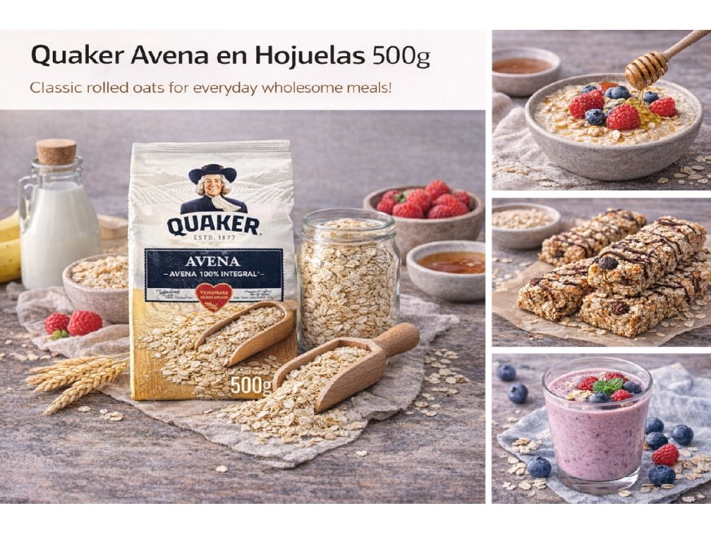 Quaker Avena en Hojuelas are high-quality rolled oats with a mild flavor and soft texture when cooked. A versatile pantry staple, they are ideal for nutritious breakfasts and home baking.