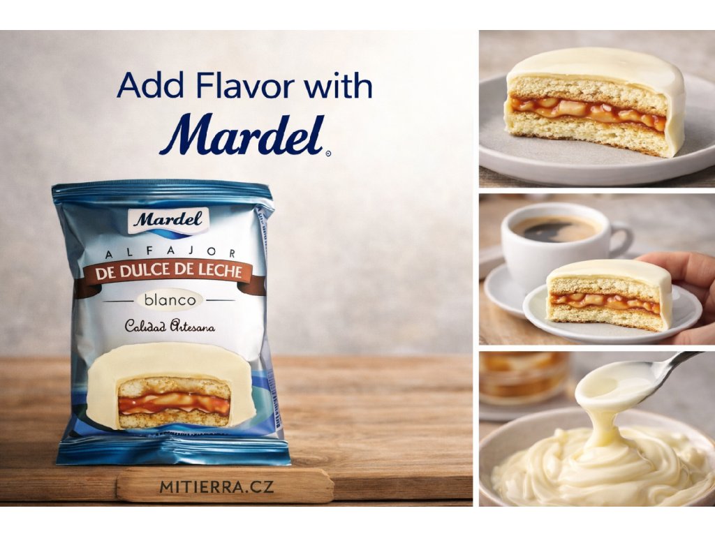 Mardel Blanco Alfajor Blanco is a sandwich style cookie filled with dulce de leche and coated in white chocolate. It features soft biscuits with a smooth caramel filling and a sweet chocolate coating. Individually wrapped, it is suitable as a convenient snack or small dessert.