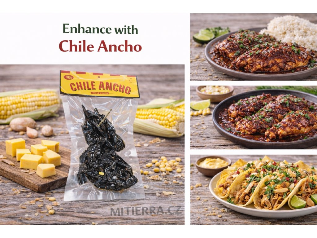 Ancho is a dried Poblano chili and one of the foundations of traditional Mexican cuisine. It has mild heat and a deep, rich flavor with notes of dried fruit, cocoa, and slight smokiness. After soaking and blending, it creates thick, dark red sauces ideal for mole, enchiladas, tacos, and stews. It adds authentic color, aroma, and complexity to your dishes.