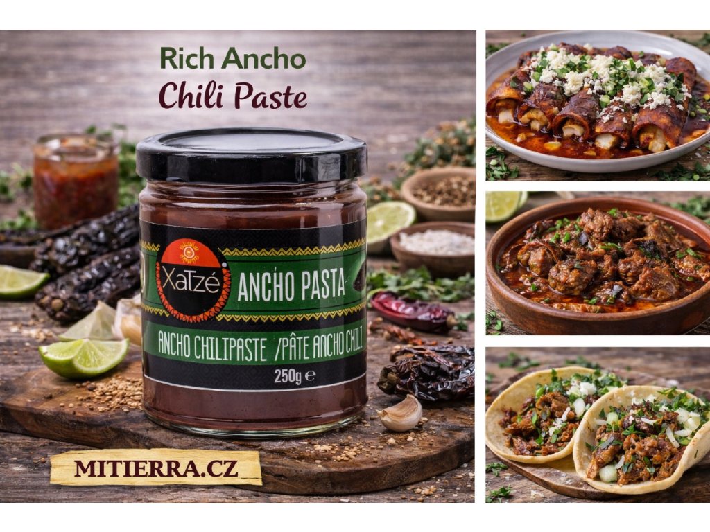 Smooth ancho chili paste made from dried poblano peppers. Mildly spicy, slightly sweet, and smoky, perfect for adding depth and authentic Mexican flavor to dishes.