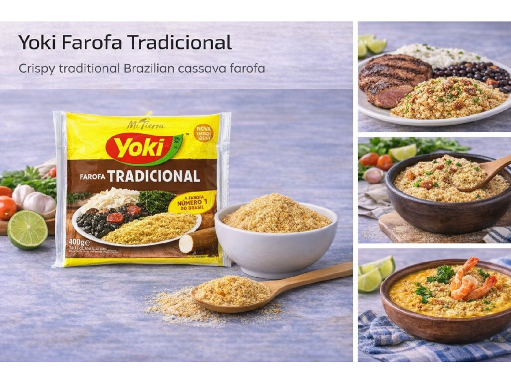 Yoki Farofa Tradicional is a classic Brazilian side dish made from toasted cassava flour, known for its crunchy texture and rich, savory flavor. A staple of Brazilian cuisine, it adds depth and texture to both simple and hearty meals.