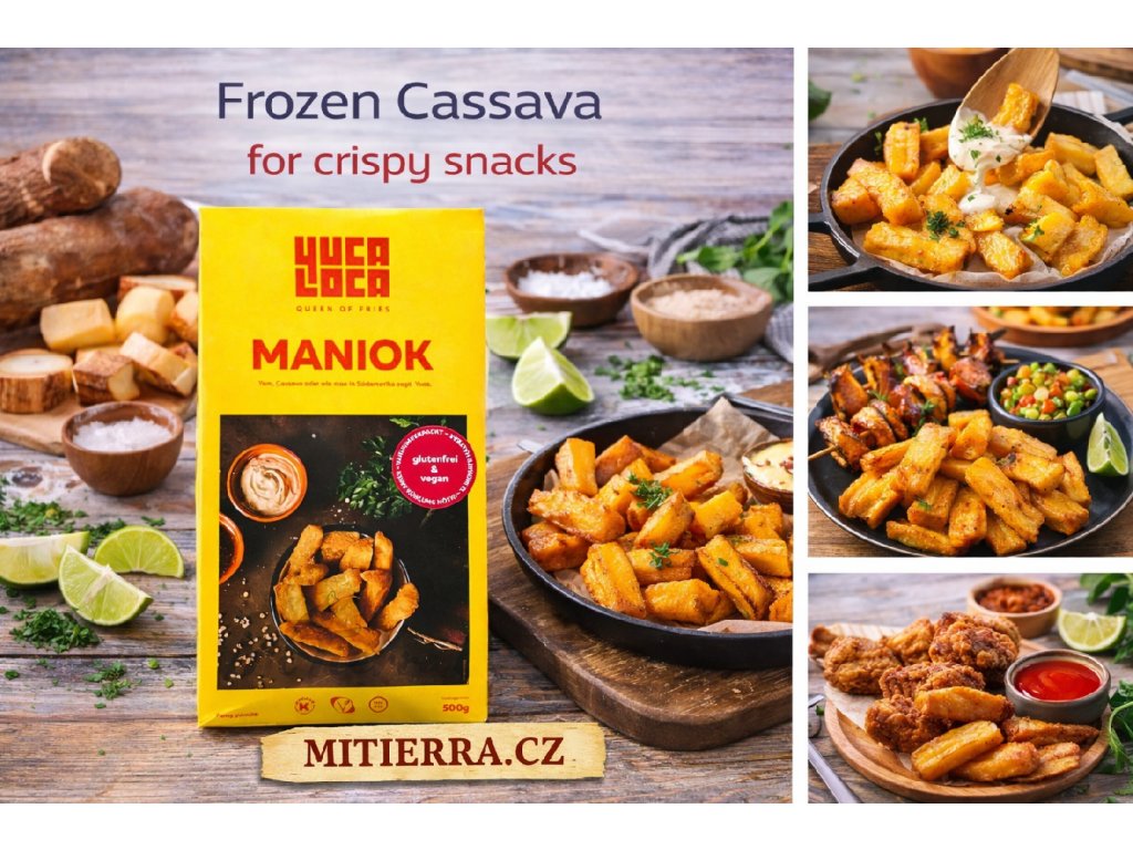 Pre-cooked cassava ready for quick preparation. Crispy on the outside and soft inside once fried or baked. A gluten-free, vegan alternative to classic fries, perfect as a snack or side dish.