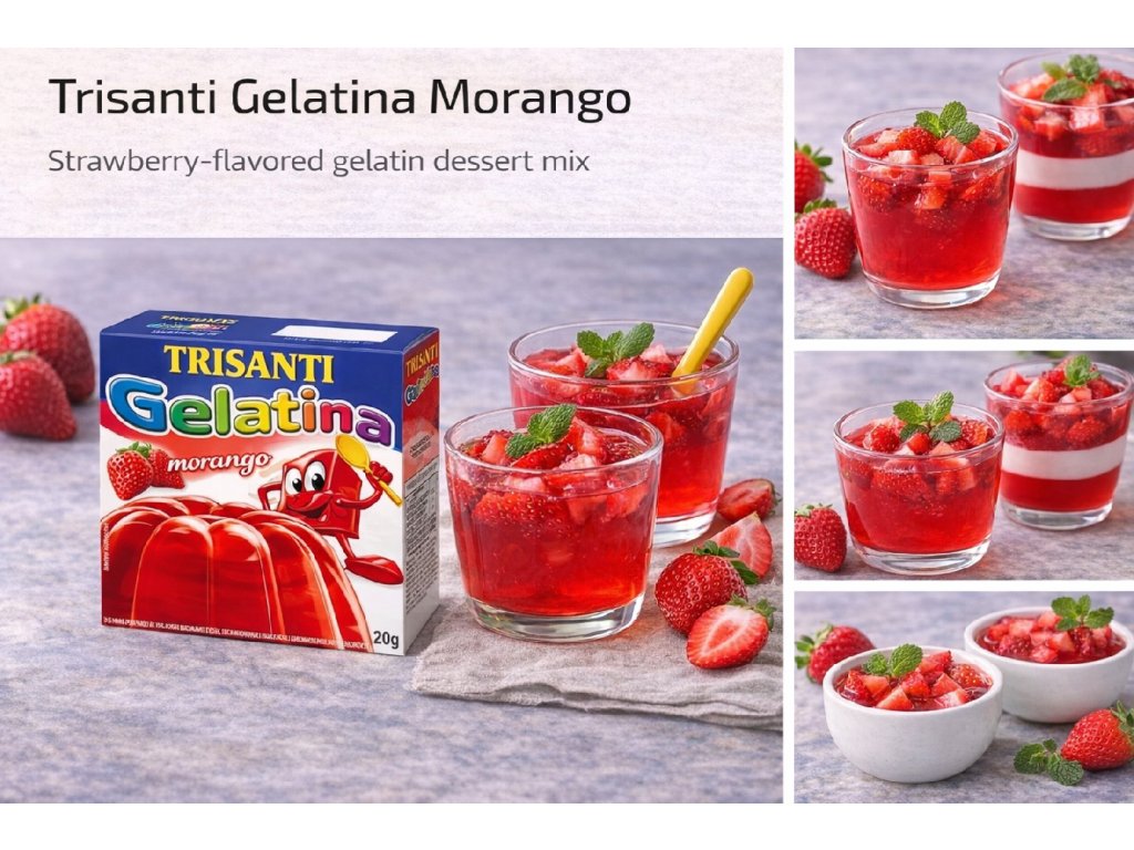 Trisanti Gelatina Morango je želatinová směs s jahodovou příchutí, jemnou strukturou a svěží ovocnou chutí. Snadná na přípravu, oblíbená jako lehký dezert pro děti i dospělé.